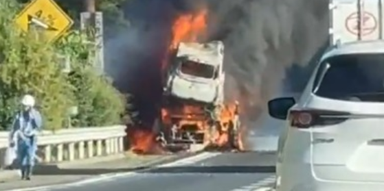 9日15時15分頃、広島県三原市の山陽自動車道(上り)・本郷IC〜三原久井IC間で「大型のキャリアカーが燃えている」と消防に通報があった。